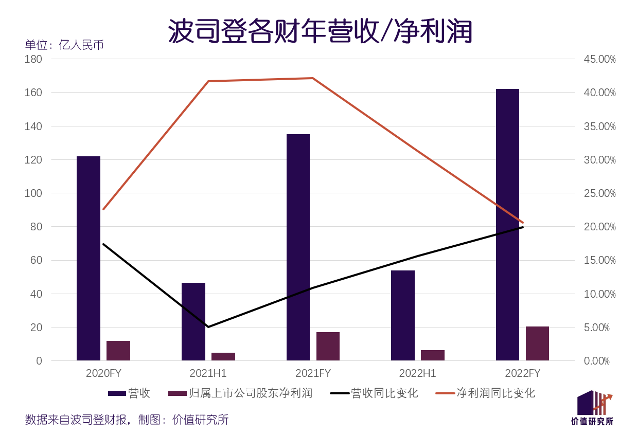 财报显示,2022财年波司登营收同比增长20%至162.13亿元,同比增长19.95%,过去五年年均复合增长率达到18.9%;归属上市公司股东净利润为20.62亿元,创下历史新高,同比增长20.58%,过去五年年均复合增长率则达到39.4%。