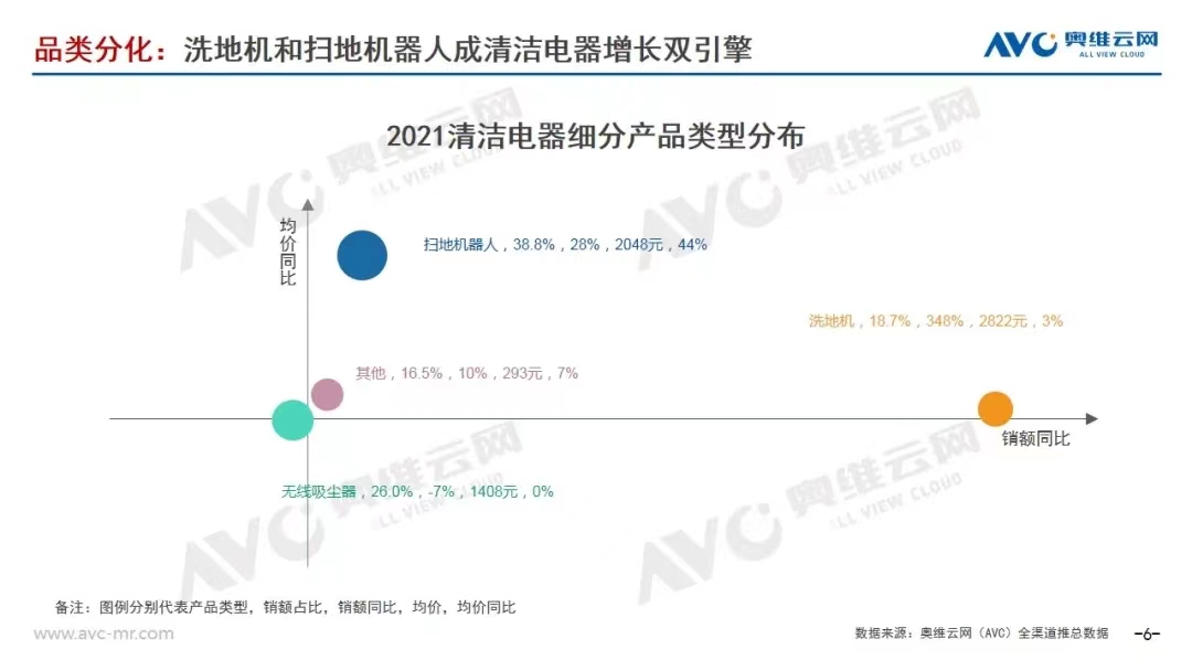 奥维云网统计数据显示,2021年清洁电器全渠道的零售量达到2980万台,同比增长2.6%;零售额高达309亿元,同比增长28.9%。其中扫地机器人的销售额占比达到38.8%,同比增长28%。新物种洗地机的销售额占比也攀升到18.7%,同比增长348%。无线吸尘器的占比已经仅剩26%,同比下降了7%,已经被逐渐瓜分。