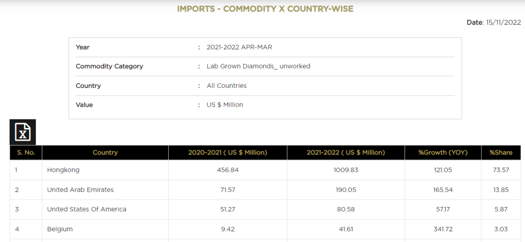 按照印度宝石和珠宝出口促进委员会官方数据,2020年4月至2021年3月以及2021年4月至2022年3月,印度向香港进口的未加工培育钻石规模均位列第一,历年进口额有4.57亿美元、10.09亿,占比一度超70%。也就是说,印度绝大多数培育钻石主要来自香港。