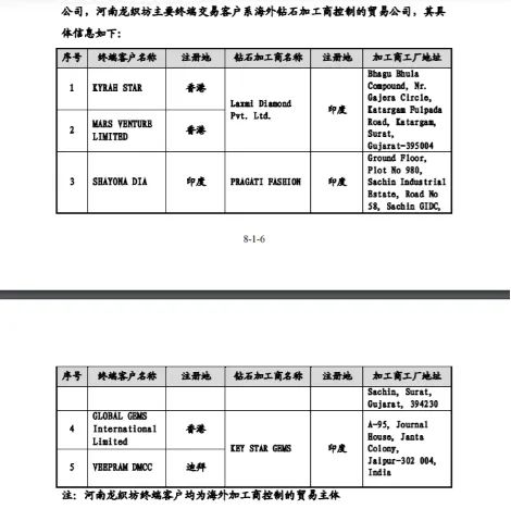 在附注中,力量钻石提到,出于贸易便利性考虑,海外钻石加工商,通常在香港等地设立贸易公司。河南龙织坊的下游客户,均为印度等海外钻石加工商控制的贸易公司。