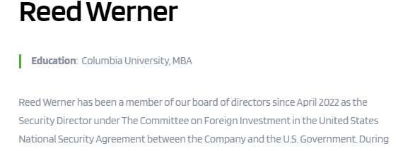 最后一位董事 Reed Werner 的身份更加值得关注:他是前美国国防部负责南亚和东南亚事务的助理副部长,也曾在高盛投行部担任高管,拥有丰富的和中国企业合作的经验。
