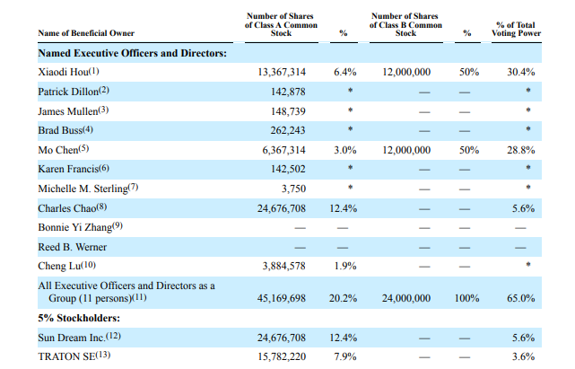 首先,图森创始人投票权极高,本不应该,也不可能被这样罢免。图森采用了 A/B 股架构,B 类股对应10票。而所有的 B 类股均由侯晓迪和陈默二人平分,结果就是他们合起来的总投票权(截至2022年6月)高达59.2%,已经占到多数。