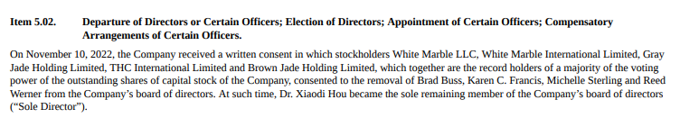 11月10日周四,图森公司收到来自五个大股东的书面文件,正式罢免原五人董事会当中的四人Brad Buss、Karen Francis、Michelle Sterling 和 Reed Werner——只留下侯晓迪一人。