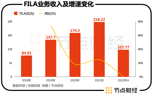 财报数据显示,今年上半年,斐乐的同比增速下滑至0.5%,再往前追溯,自2020年开始,斐乐的增速就直线暴跌到20%左右。