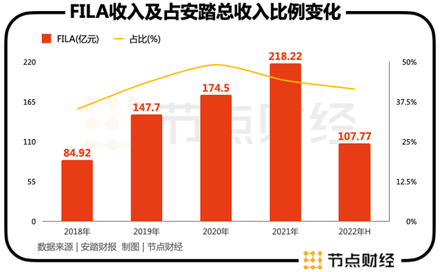 根据安踏财报,今年上半年,斐乐业务实现营收107.8亿元,占安踏集团总收入的41.5%。2021年全年,斐乐营收首次突破200亿元至218亿元,这一体量仅比同期李宁的总收入少了8亿元。