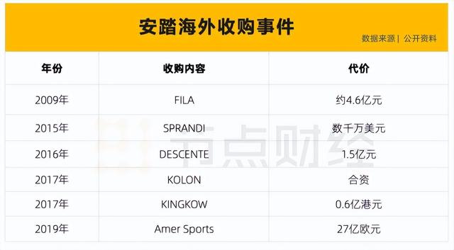 据节点财经统计,自2009年-2019年,安踏总共斥资超220亿元用于收购外国运动大牌,其中花费最大的一笔是2018年底对Amer Sports(亚玛芬体育)的收购,收购代价高达27亿欧元(安踏持股部分),占所有收购金额的97%。