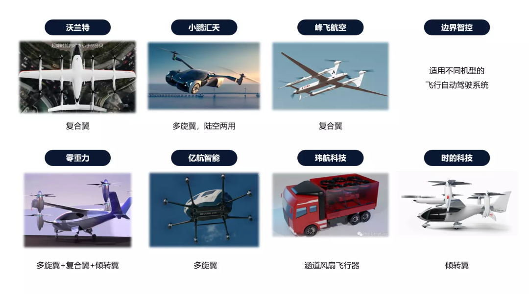 国内值得关注的创新公司有:沃兰特航空 (复合翼) 、零重力飞机工业 (倾旋翼方案,同时有前两款技术积累) 、时的科技 (倾旋翼) 、WEFLY齐飞等。