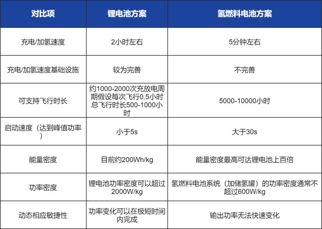 相对锂电方案,虽然氢燃料电池存在能量密度高、电池寿命长等优势,但在动态响应性及功率密度上存在一定不足 (航空通常要求1500W/kg的功率密度,而氢燃料电池系统仅仅只能达到600W/kg) ,因此长期来看,我们认为氢燃料搭配一部分锂电池储能是更优方案,锂电池可用于启动和提供快速变化的功率输出,氢燃料电池可用于续航中的能量输出。