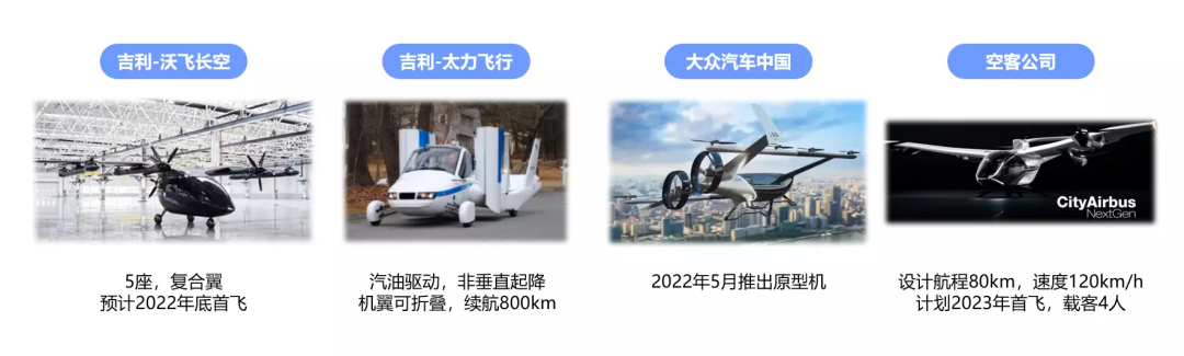 目前国内产业巨头中,量产进展相对领先的是吉利集团,旗下拥有沃飞长空及太力飞行两家公司,在专利布局方面最领先的是大疆科技(虽然并未开始推出相关产品) 。