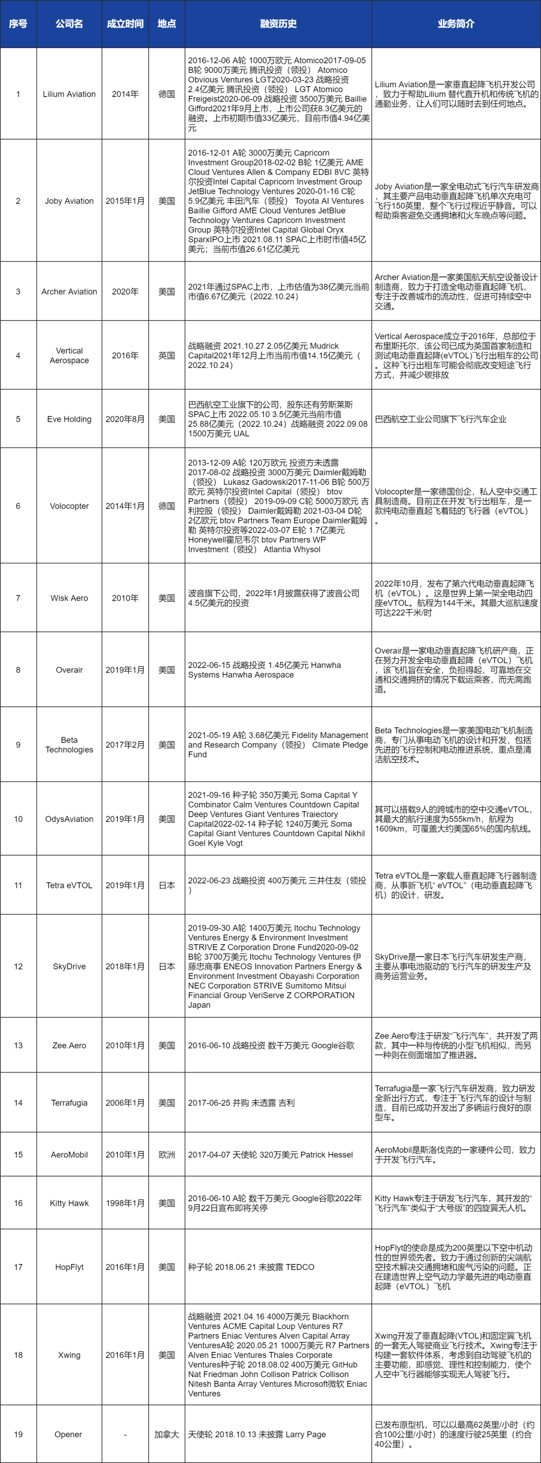 总结:国外飞行汽车领域的独角兽公司普遍成立时间较早,集中于2014-2015年成立;