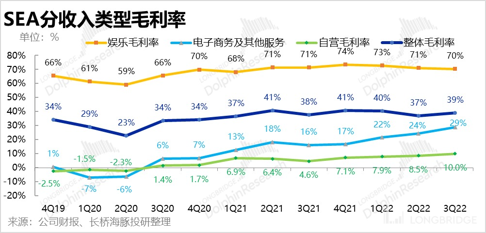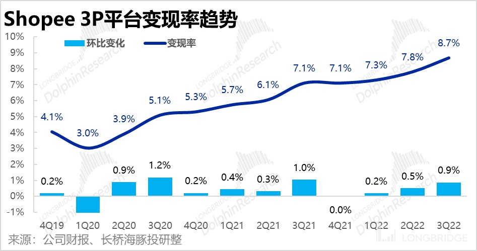 在提出了公司自营电商收入后,经计算,本季度 Shopee 3P 电商业务的变现率为 8.7%,环比上季度大幅增加了 90 个基点。同时,本次公司额外披露了 3P 业务的收入拆分。约 16 亿的 3P 收入中,约 10 亿来自佣金和广告费等 “有效变成”,此部分同比增长了 54%,明显高于整体收入增速。而 “无效变现” 的物流等服务收入则为 6 亿左右,同比增长了 20%。同时由于佣金广告等 “有效变现” 毛利更高,对板块的盈利改善也会有不小的促进。
