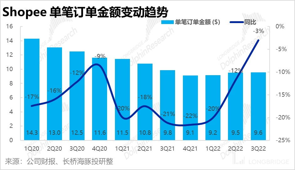 从价量驱动角度,由于公司基本退出了核心东南亚各国和巴西以外的其他全部市场,本季 Shopee 订单量与上季一致同样在 20 亿单,可见订单量是 GMV 停止增长的主原因。价的角度,在摆脱了新兴市场的低客单价拖累后,Shopee 整体的客单价在持续回升,本季达到 9.6 美元,较最低点已提升了 50 美分。后续随着 Shopee 继续深耕核心市场应当还有继续提升的空间。