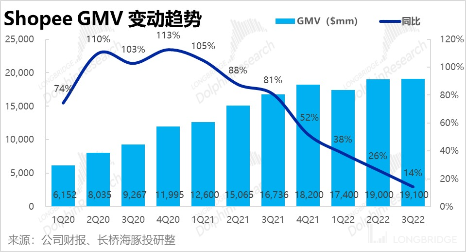 具体来看,本季度 Shopee 实现 GMV191 亿,同比增速进一步下滑至 14%,比上季度 190 亿的 GMV 完全无增长,但实际表现与预期基本一致,可见增长放缓早在市场预料之中。