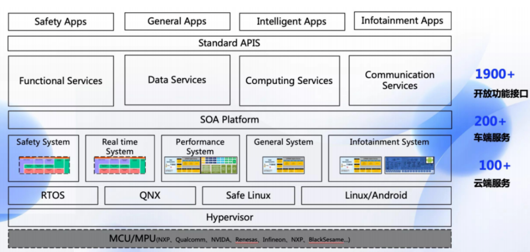 从虚拟机到系统内核,大家可以简单理解为基于硬件层应用的各类操作系统,比如基于QNX系统内核的车载OS和Linux系统内核的车载OS。
