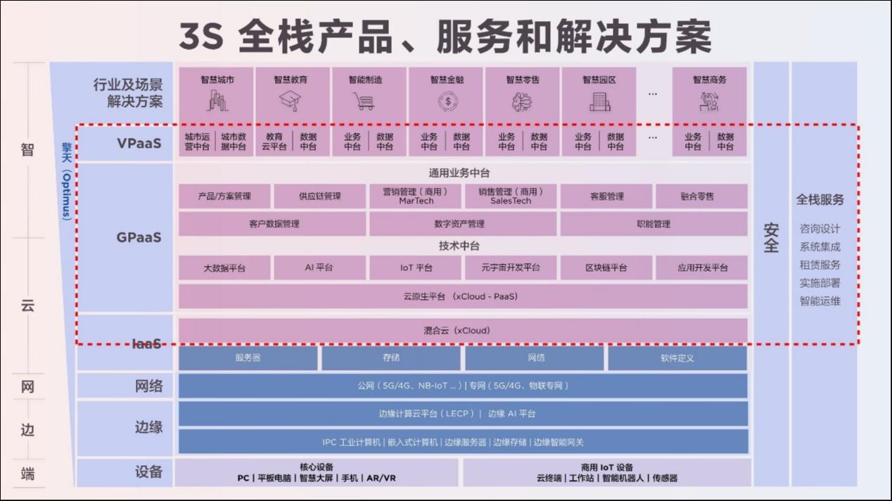 其中方案服务领域积淀、孵化而来的中台化、云原生、AI内嵌的智能IT引擎“擎天”,是驱动全栈能力落地各行业场景的关键驱动力。据悉,擎天包括混合云(xCloud)的IaaS层、技术中台和通用业务中台的GPaaS层,以及面向智慧城市、智慧教育、智能制造、智慧金融等多个行业的VPaaS层。依托擎天的关键驱动,从智能终端、基础设施到解决方案,提高了企业智能化转型的速度。