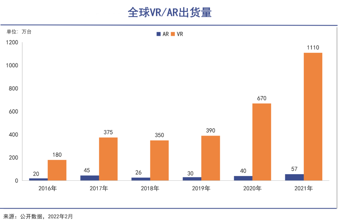 距离VR硬件行业头部企业Oculus 发布首台原型机已经过去了十二年,快速发展后的全球VR硬件出货量在2021年达到了1110万台,VR/AR 硬件与内容生态也形成了协同发展的正循环。