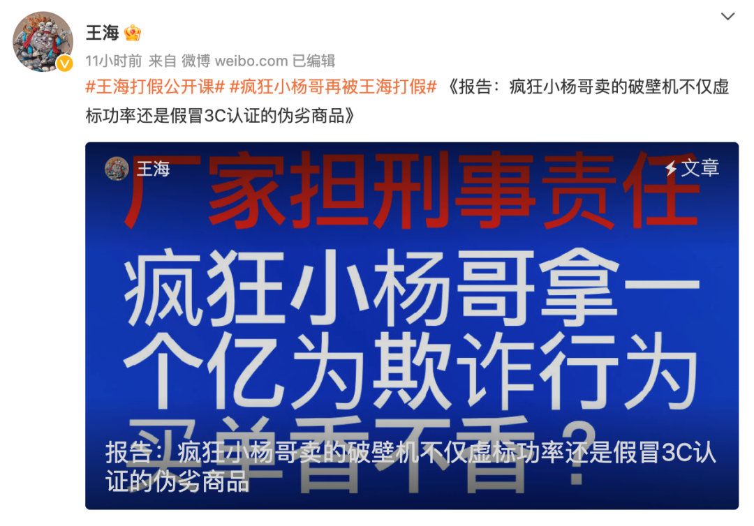 这份报告一开始并未引起金正电器和疯狂小杨哥的重视,直到11月15日,王海在微博发布了一份《疯狂小杨哥卖的破壁机不仅虚标功率还是假冒3C认证的伪劣商品》的报告文章,封面配图中打上了“厂家担刑事责任”“疯狂小杨哥欺诈行为”等醒目文字,文章不仅直指金正电器页面涉嫌虚假宣传,而且以飞利浦的产品为对比,其3C证书显示搅拌功率180W,产品标识标的就是电机功率180W,指证金正破壁机是假冒/冒用3C认证的产品。