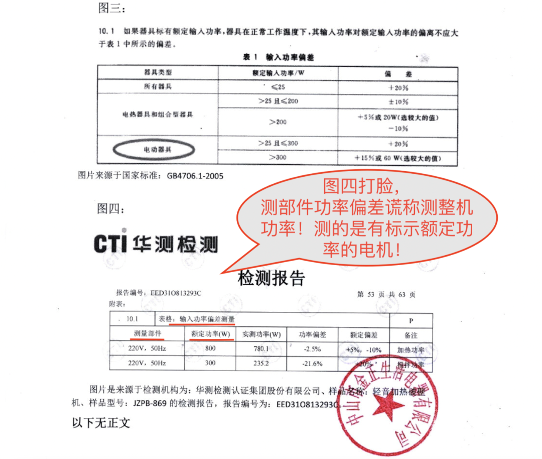 王海还在报告中指出,《3C认证证书》表述的“搅拌功率”就是指搅拌电机的功率,疯狂小杨哥和厂商自始至终没有宣传或标示过整机额定功率,而对方澄清声明附带的检测报告附表恰好证明其以次充好。