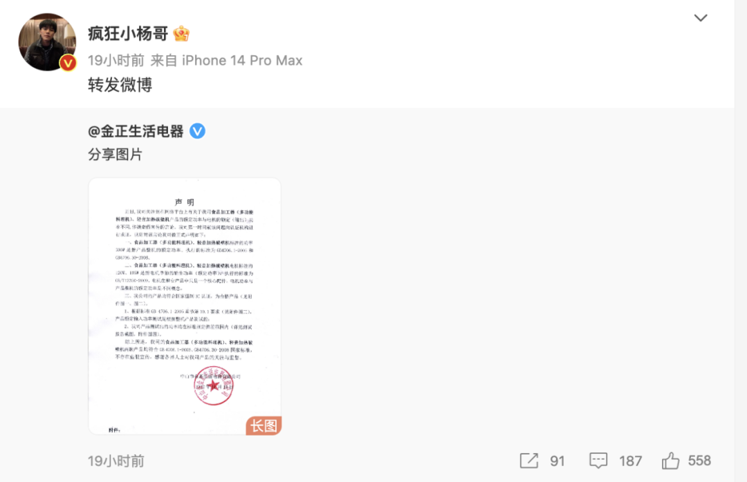 事件发酵三天后,11月15日,遭遇打假的金正生活电器在微博发表了澄清声明,称多功能料理机和破壁机均符合国家标准,不存在虚假宣传。疯狂小杨哥也转发了金正生活电器的微博,并在评论区回复网友称:“我只想做好自己,一切为你们服务,但是少不了后面......”