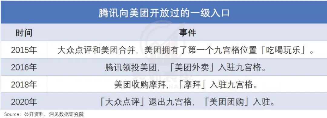 比如,自从把美团纳入阵营后,腾讯对美团的流量倾斜力度持续增大。统计显示,微信对美团开放过的一级入口,是腾讯“干儿子”里最多的。
