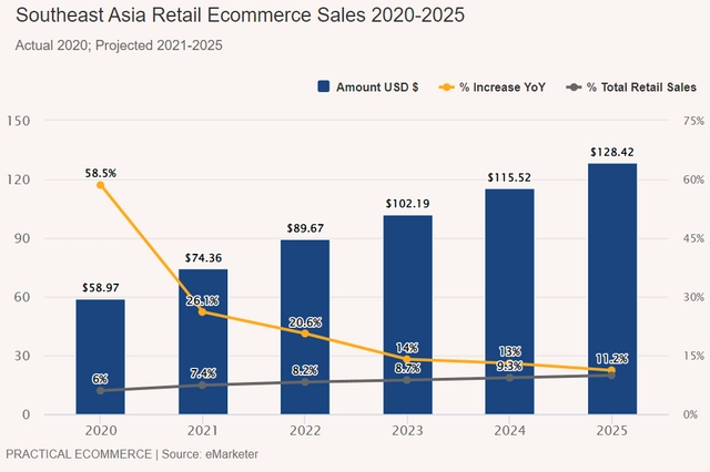 但是,2021年以来, 东南亚的电商增速明显放缓 ,增速下降至20%左右,根据市场研究机构eMarketer预测,未来三年东南亚电商市场增速将会降至10%左右。资本迅速的催熟了东南亚电商市场。
