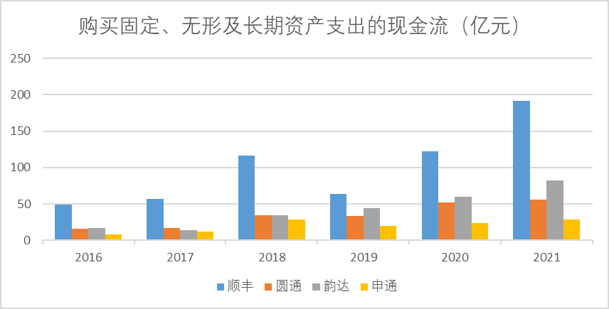 最后便是顺丰的资本开支远高于同行,我们从每年购买固定资产、无形资产及长期资产的现金流中可以看出,顺丰自上市以来支出均高于同行,甚至在一些年份高于其余三家之和,高昂的成本支出和资本开支必然会导致顺丰在成本端劣势放大,自然而然无法从价格内卷中占到什么优势。