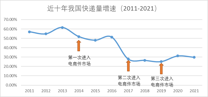 图: 顺丰进场时机与快递量增速关系,图片来源: 锦缎制图