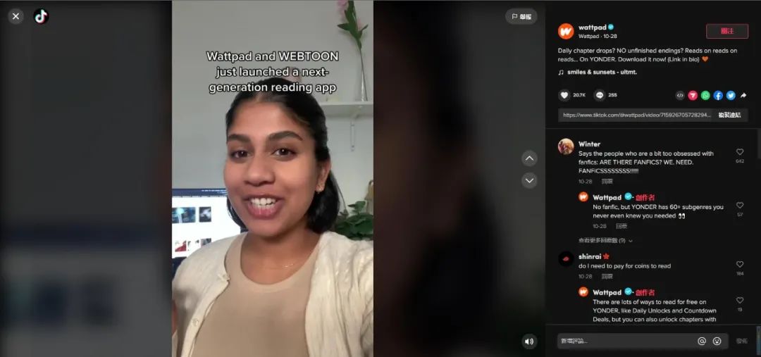 TikTok 上,Wattpad 为 YONDER 引流 | 图片来源:TikTok