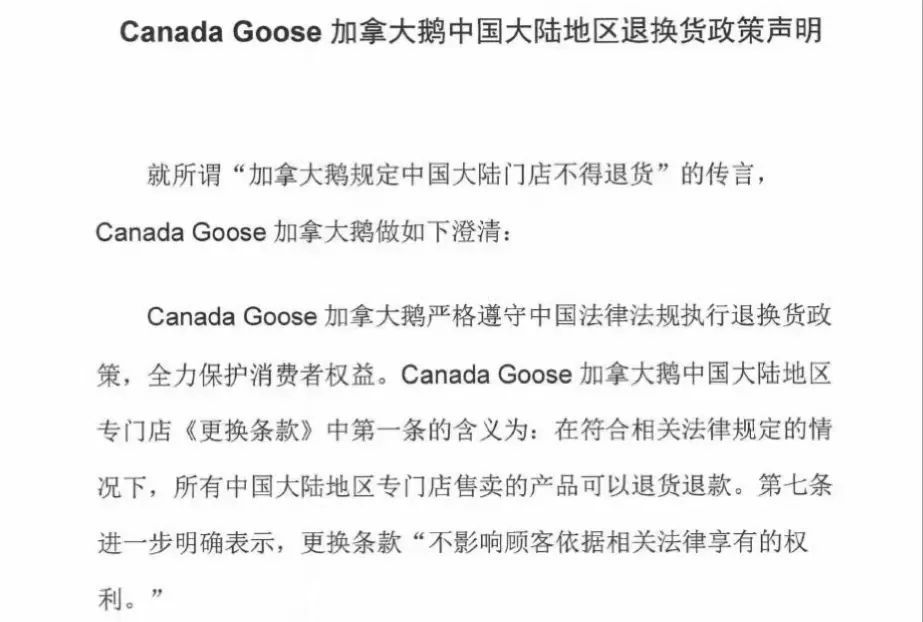 加拿大鹅退换货声明,图源加拿大鹅官方微博
