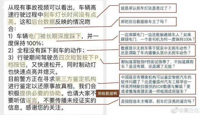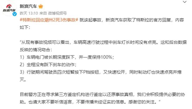 事故发生后的一周,一位自称事故司机的亲属在微博上发布长文。在讲述了事故经过的同时,该博主把矛头直指特斯拉,强调特斯拉存在失控加速、制动失灵的问题,请求有关部门进行调查。