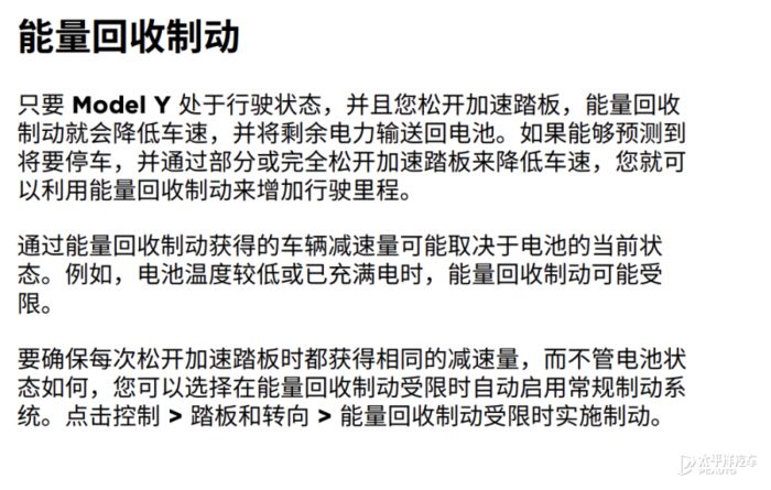 另一方面,在特斯拉的用户手册中还提到了“能量回收制动受限”的情况。其说明,车辆可能会在接近满电时,为保护电池过充,减弱动能回收;或者在电池温度不够时,可能会经常发生受限情况。