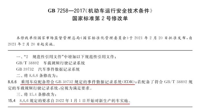 接着我们来说后台数据是否有被篡改的可能性。与飞机上的“黑匣子”类似,汽车上同样有一个完整的、有效的车辆碰撞事件数据记录系统,被称为EDR。国标政策显示,从2021年1月开始,我国新生产的汽车应全部装配EDR。
