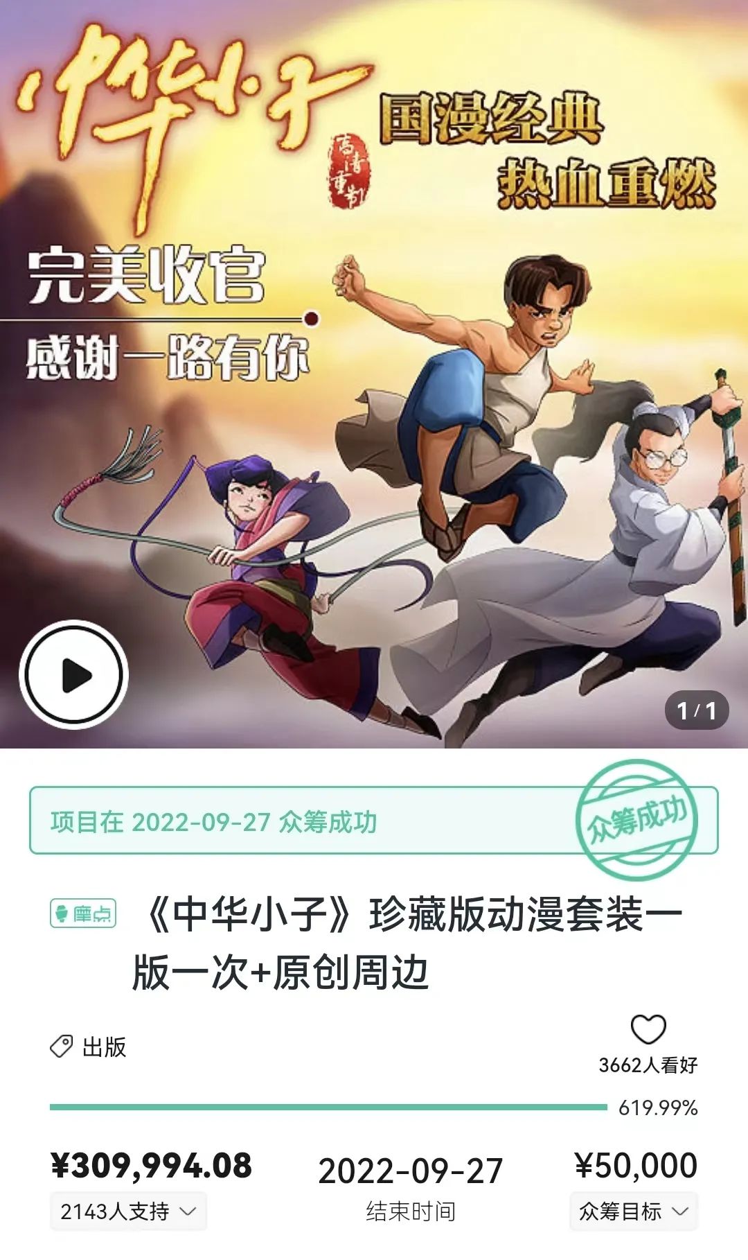 今年9月,《中华小子》珍藏版周边套装在摩点众筹,筹得资金远超目标。
