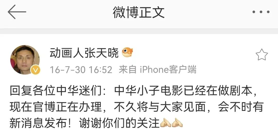 2016年,张天晓发微博透露《中华小子》电影正在策划中。直到现在,也有不少网友会去这条微博下评论,表示自己还在等,甚至心甘情愿地表示“等多久都没关系”。