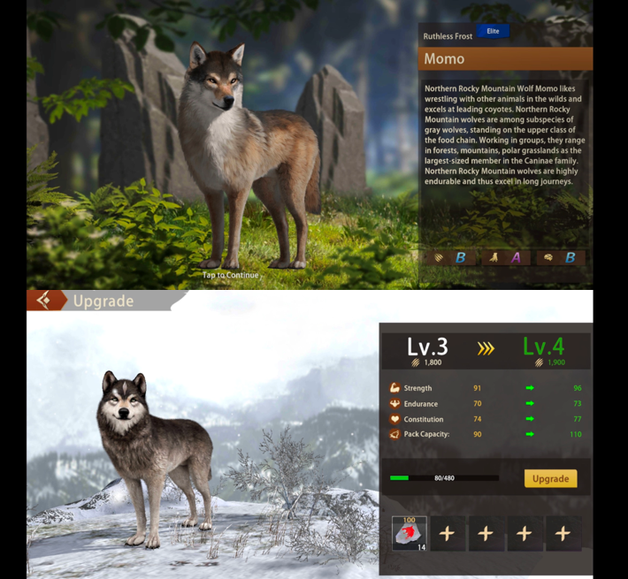 《Wolf Game》是一款以野狼为主角的SLG手游,游戏故事背景设定为狼族王子复仇。狼王被杀,王子逃脱,为报杀父之仇,狼王子重振旗鼓,誓要重建部落……基于以上的游戏世界观,游戏真实还原了狼族生活,画风写实,尽可能还原狼族的体态、动作,同时游戏结合真实的狼族部落,参考狼群知识,还原狼族的社会构成。