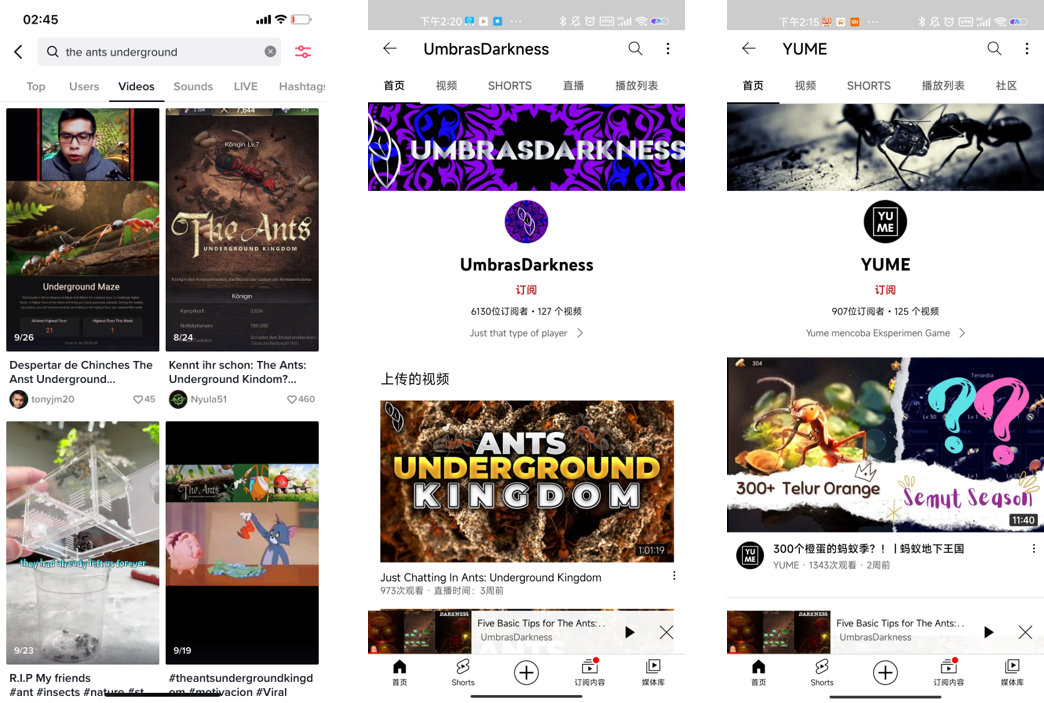 《小小蚁国》还另辟蹊径,通过TikTok、YouTube等社交媒体,与相关博主合作推广游戏,结合博主在社交媒体的个人影响力,形成话题,吸引博主粉丝进入游戏。