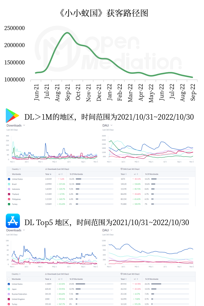 自游戏上架以来,Google Play累计下载量超1000万次,App Store累计下载量超500万,全球日活用户数量超170万。从这个数据来看,《小小蚁国》可以说是非常成功的一款游戏。