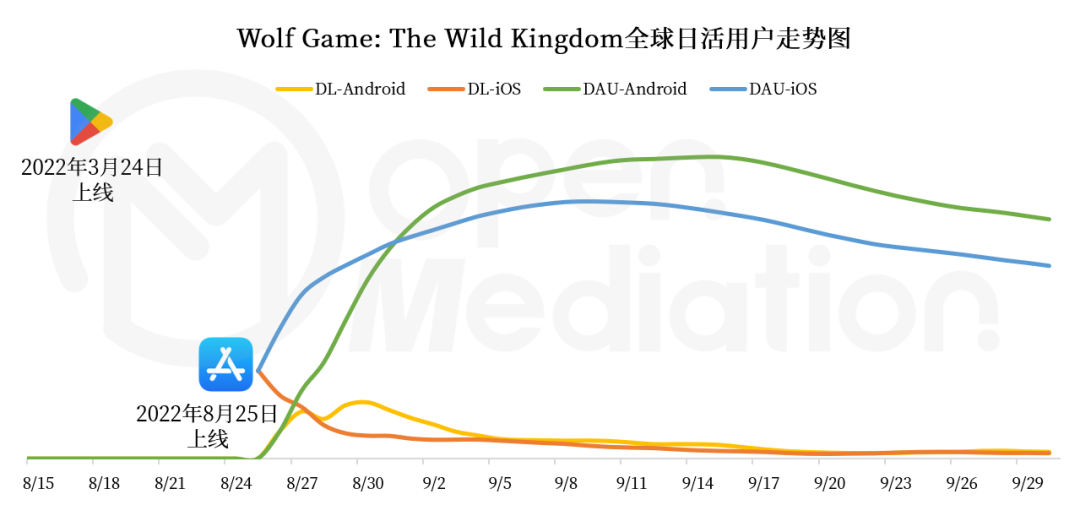 《Wolf Game》Android端上架于2022年3月,iOS端上架于2022年8月,玩家数量增长自iOS端游戏上架后开始。对比两端的数据,Android端日活用户体量明显高于iOS端。