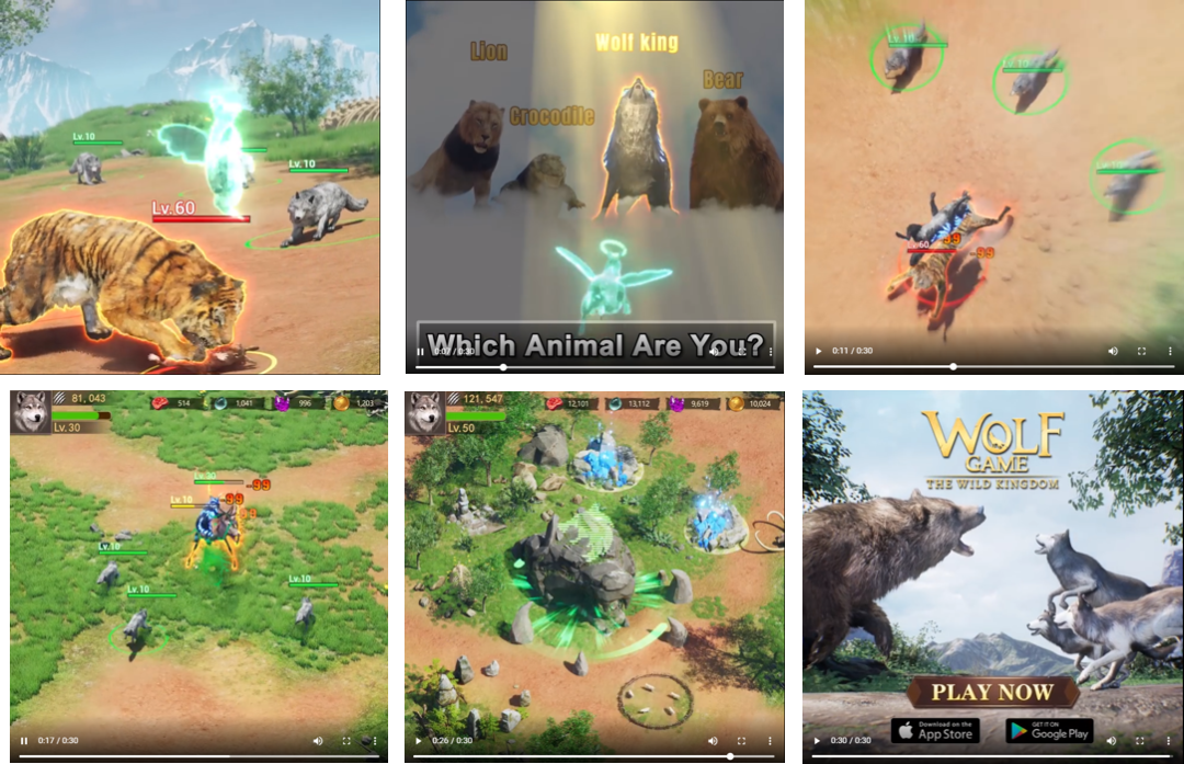 从游戏广告素材来看,《Wolf Game》的爆款素材主打“弱肉强食”。一只兔子命丧虎口,转世重来,投胎为狼王,带领族群征战动物世界。
