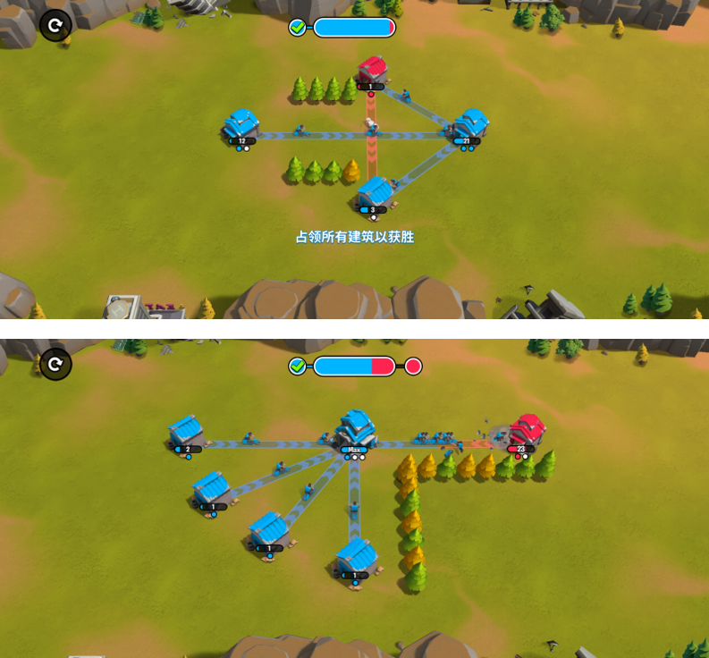 与传统意义上的SLG游戏不同,《猿族时代》在游戏中融合了RTS元素和PVE玩法。在游戏中,玩家需要通过连线派兵,占据敌人据点,攻占对方所有据点方可获得胜利,类似的游戏玩法最早出现在超休闲品类中。
