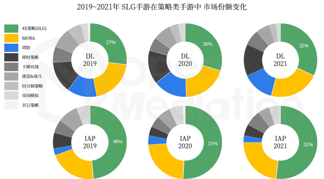 从策略的细分玩法来看,SLG是流量及营收的主要来源。过去三年,策略品类中,SLG玩法市场份额逐年增长。下载量从2019年的27%增长到2021年的32%,营收从48%增长至52%。