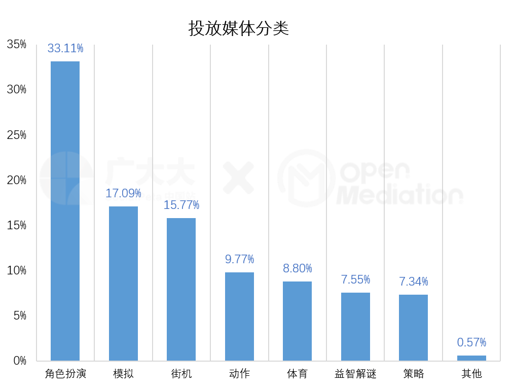 游戏将广告素材的关键词聚焦在了“RPG”上面,数据显示,游戏在投放期间,有超过33%的素材为“角色扮演”,而与游戏定位相同的策略类素材仅有7.34%。
