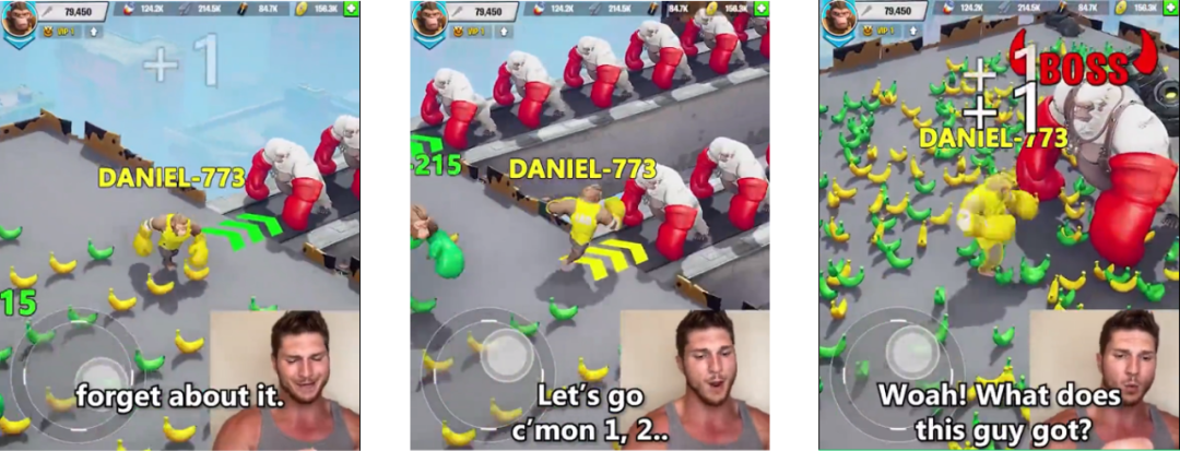 游戏在广告素材的设计上,主要体现了“竞技”元素,体型不对等的猩猩、遍地的香蕉、厚重的拳击手套、简单的摇杆操作,收集香蕉、打败猩猩、对抗BOSS,简化玩法展示。