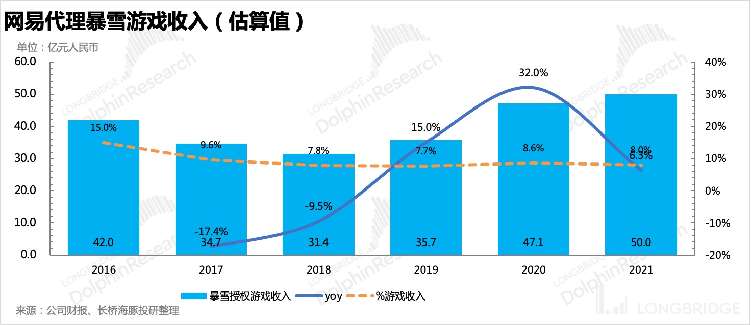 另外网易财报来看,代理所有外部游戏的收入 2021 年占到网易总收入的 13.3%,上述代理暴雪的收入占整个代理收入的 50%。
