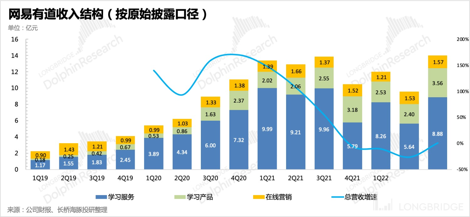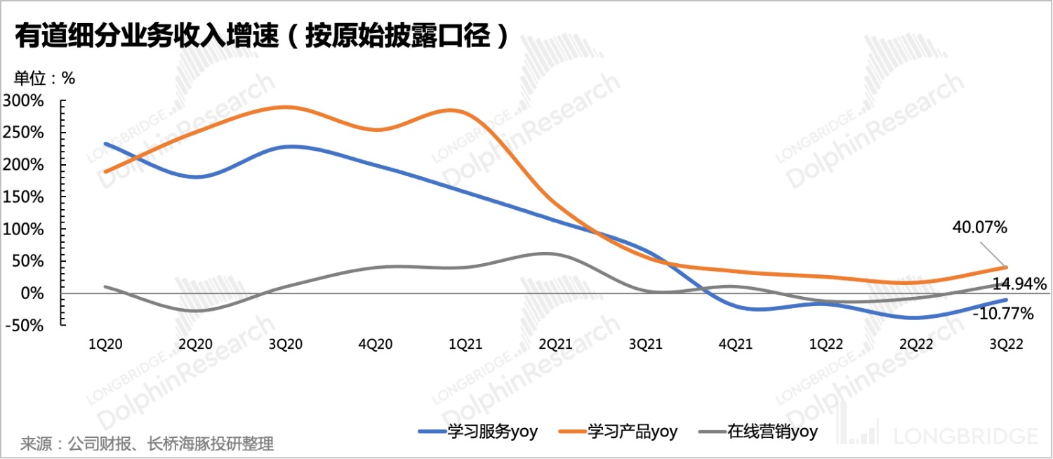 另外,虽然当下广告逆风,但有道的营销业务已经回到正增长。这恐怕与去年三季度教育双改的影响出现,教育类广告快速撤退从而导致基数较低。