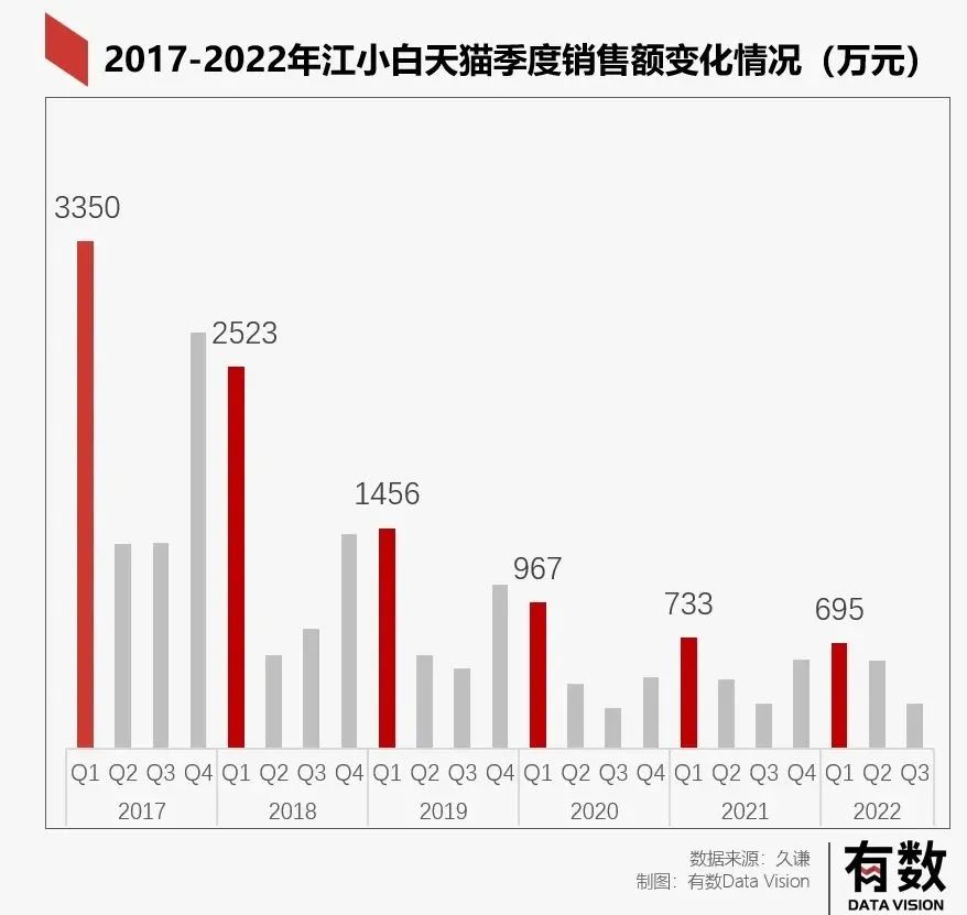至于线上,别看江小白在社交媒体风起云涌,但它的线上销售额却不值一提。在天猫,今年一季度只卖出了695万,仅有2017年同期销售额的20%。