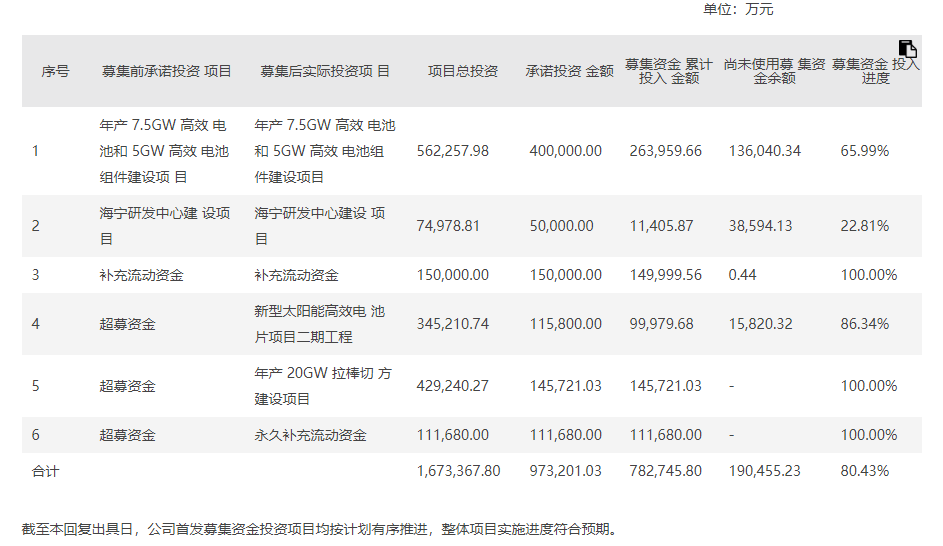 针对以上质疑,晶科能源一一做了回复,首先就是募资项目的进度。