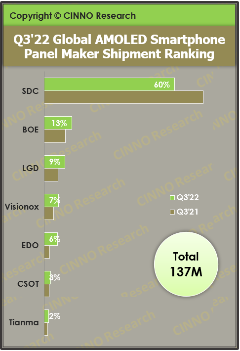而在这种情况下,国产屏幕厂商们反而实现了逆势增长,根据根据CINNO Research调查数据显示,在今年第三季度全球市场AMOLED手机面板出货量同比下滑4.8%,总出货量约为1.4亿片。有意思的是,从出货地区来看,韩国地区的份额占到69.6%,国内厂商的出货份额达到了30.4%,相比同期去年增加了10.1%,这也是国产厂商首次份额超过30%。