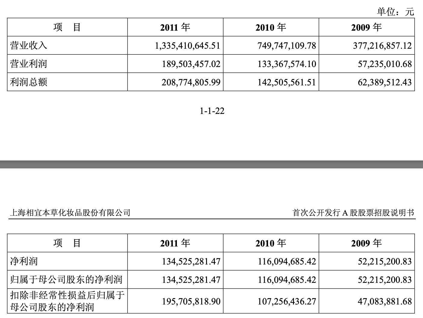 与此同时,相宜本草迎来在国内美妆市场的“黄金时代”,三年间的年营收近乎实现翻倍增长。2012年招股书披露,2009年至2011年,相宜本草营业收入分别为3.77亿元、7.5亿元、13.35亿元;净利润分别为5221.52万元、1.16亿元、1.35亿元;毛利率分别为78.65%、79.87%、80.34%,高于同业上市公司。