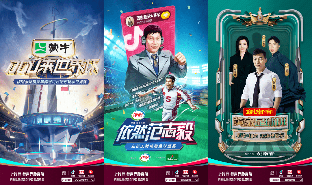 手握版权的抖音吸金力超群,为名嘴定制的多个栏目都招揽到不同行业的金主,其中乳企蒙牛冠名了每日世界杯观赛指南节目《DOU来世界杯》,范大将军脱口秀栏目《依然范志毅》拿到了伊利冠名、喜力啤酒赞助。